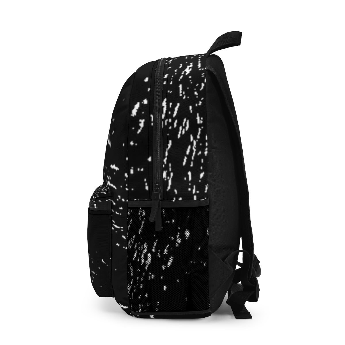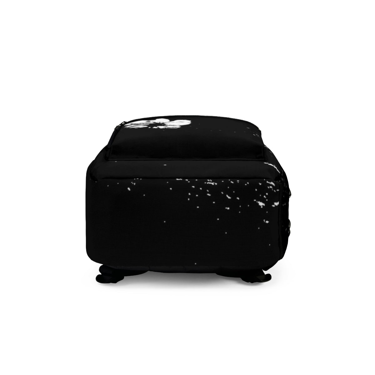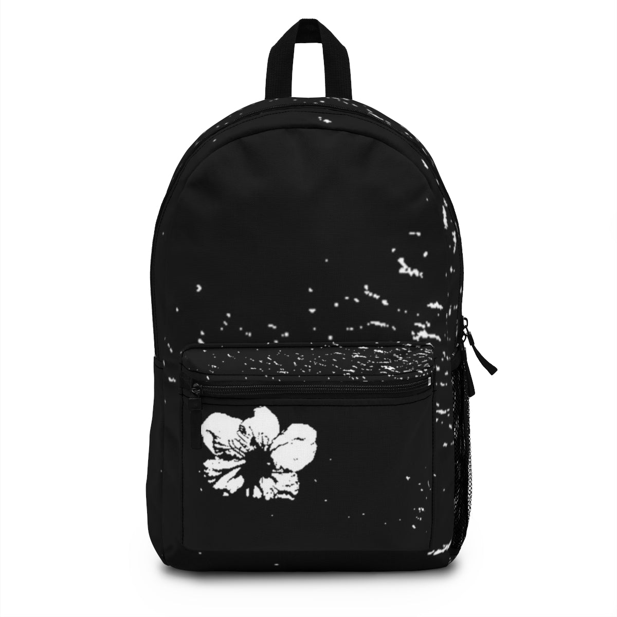 There’s a quiet kind of confidence in this black and white floral backpack. The Night Bloom doesn’t shout — it lingers. A soft scattering of pale specks drifts across deep black, and on the front, a single white flower rests. Still. Certain. Like it grew there on purpose.